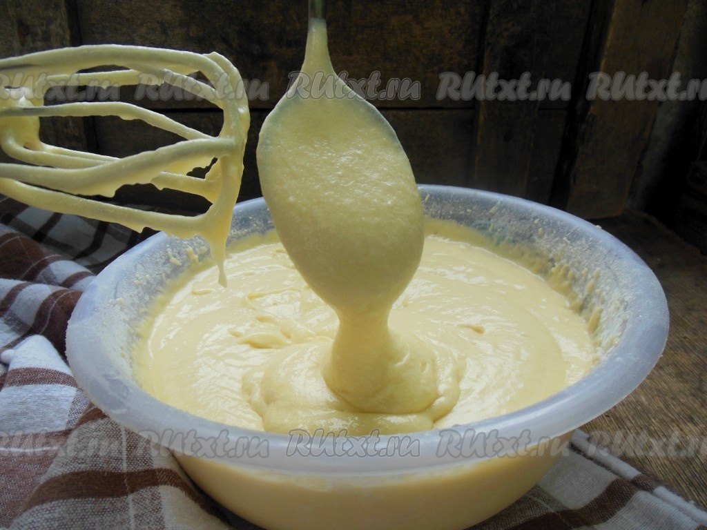 Готовое тесто напоминает домашнюю густую сметану, легко стекает с ложки.