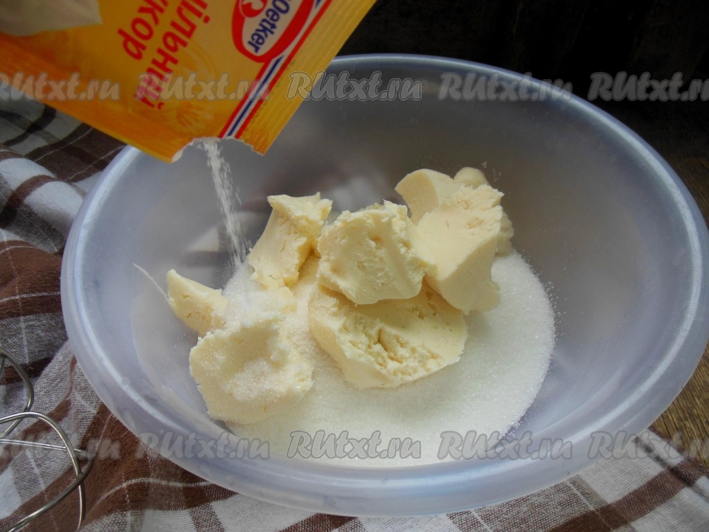 В миску добавьте сахар, ванильный сахар и сливочное масло комнатной температуры.