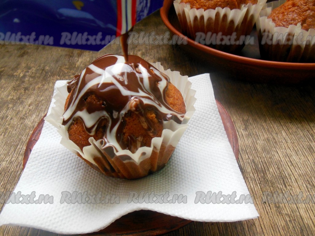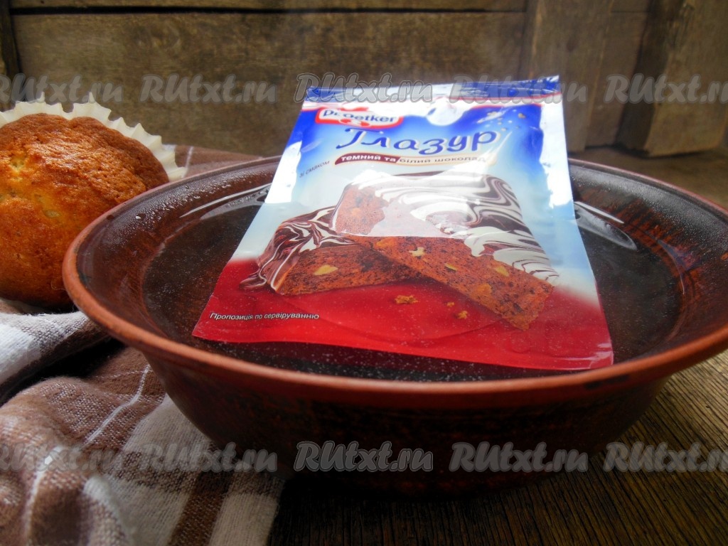 Дайте кексам полностью остыть. Очень вкусные кексы можно сразу подать к столу, а можно сделать их более нарядными, украсив выпечку. Для украшения я использовала покупную двухцветную шоколадную глазурь из черного и белого шоколада. Для приготовления глазури залейте упаковочку горячей водой, но не кипятком, оставьте на 5 минут. Масса должна стать в пачке однородной.