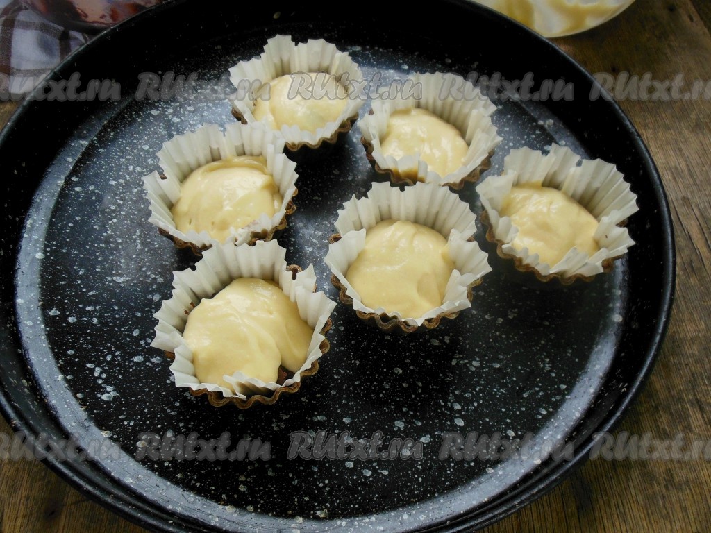 В формочки для кексов поставьте бумажные капсулы, смазывать их не нужно. Если у вас нет бумажных капсул, то смажьте железные формочки растительным или сливочным маслом, силиконовые формочки можно не смазывать. С помощью чайной ложки заполните форточки тестом на 2/3 объёма, выкладывая поочередно два вида теста (например, вначале выложите ложечку шоколадного, сверху - белое, затем - снова шоколадное и продолжайте чередовать, пока формочки не заполнятся на 2/3 объёма). На каждый кекс у меня ушло, примерно, по 4-5 чайных ложек теста.