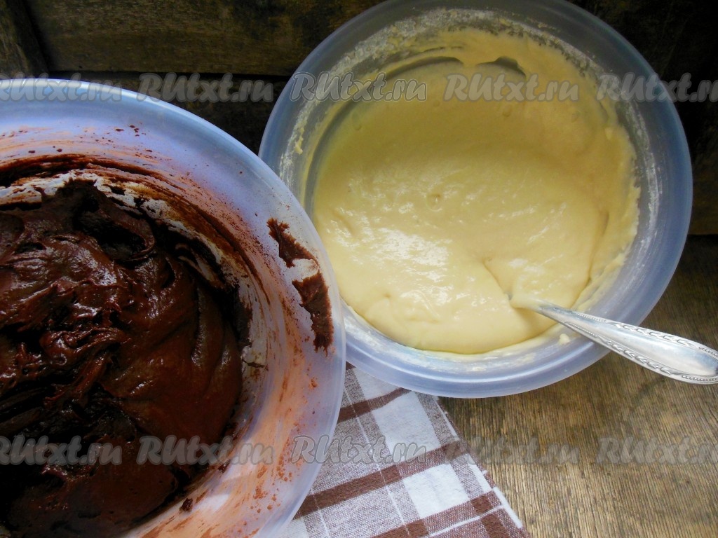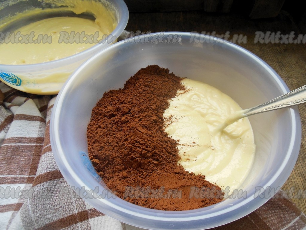 Размешайте какао в тесте до однородности вилкой или же используйте миксер. Тесто с какао получится более густым, чем белое тесто.