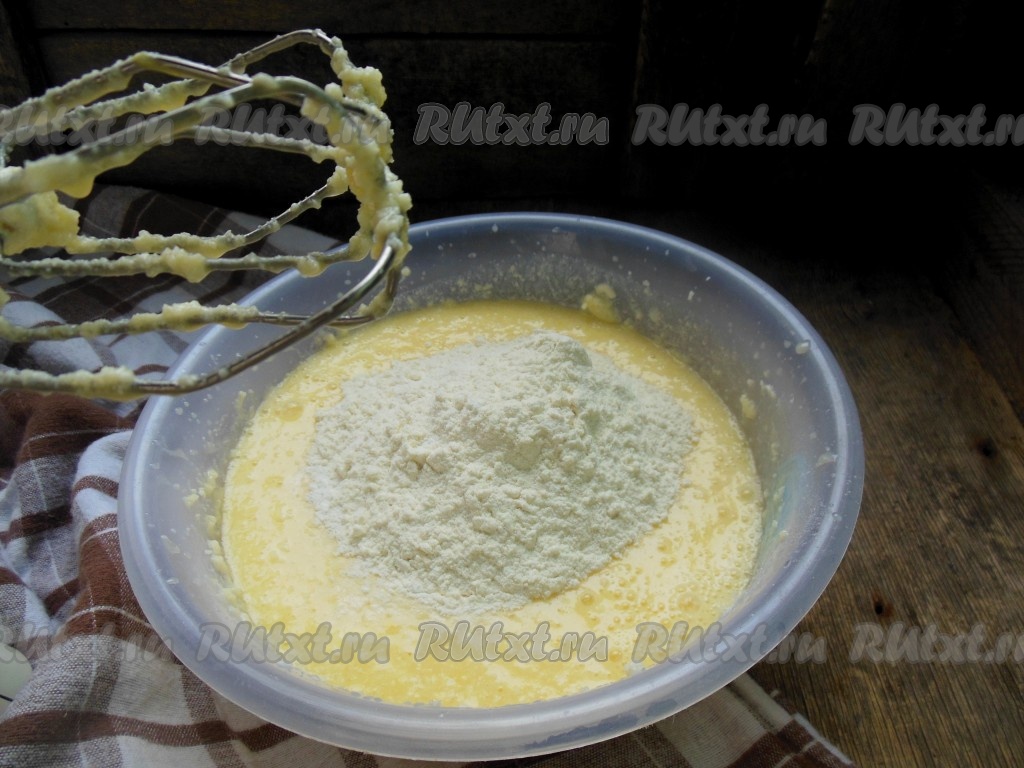 Добавьте просеянную муку с разрыхлителем, еще раз взбейте миксером.