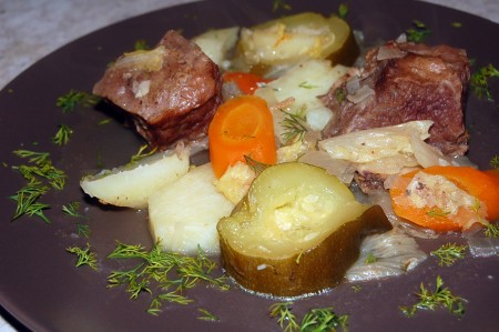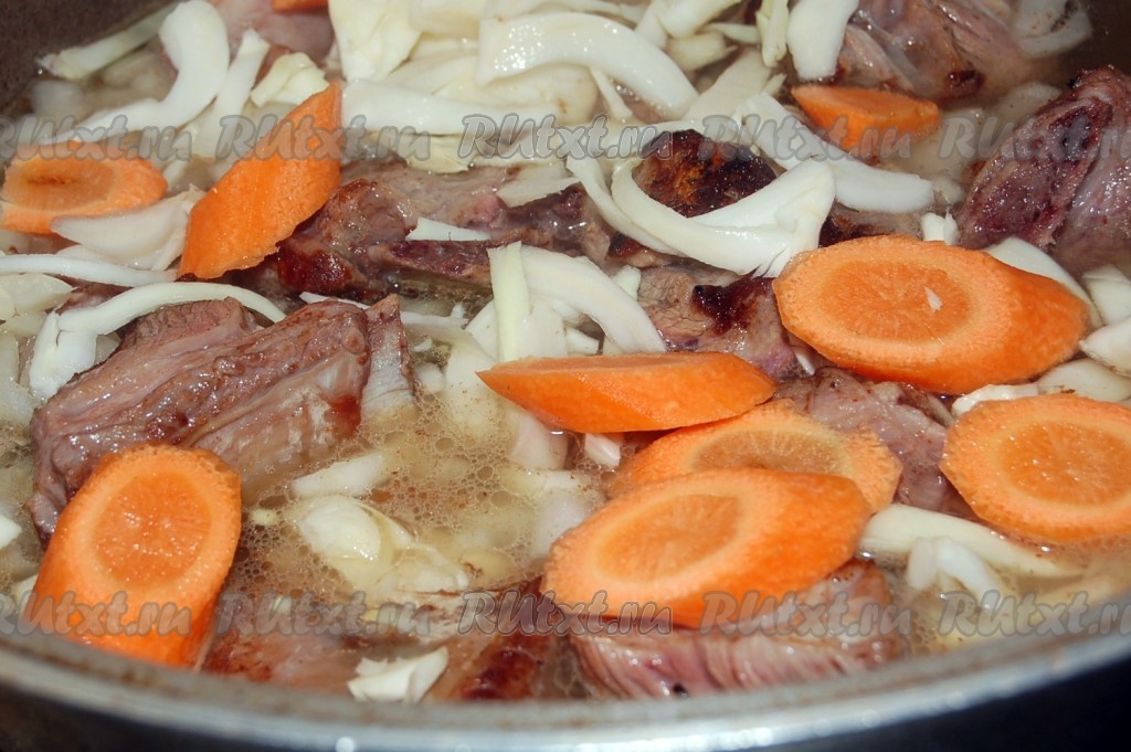 Закрыть казан крышкой и поставить тушиться на маленького огоньке. Через 1,5 часа говяжьи ребрышки с овощами готовы.