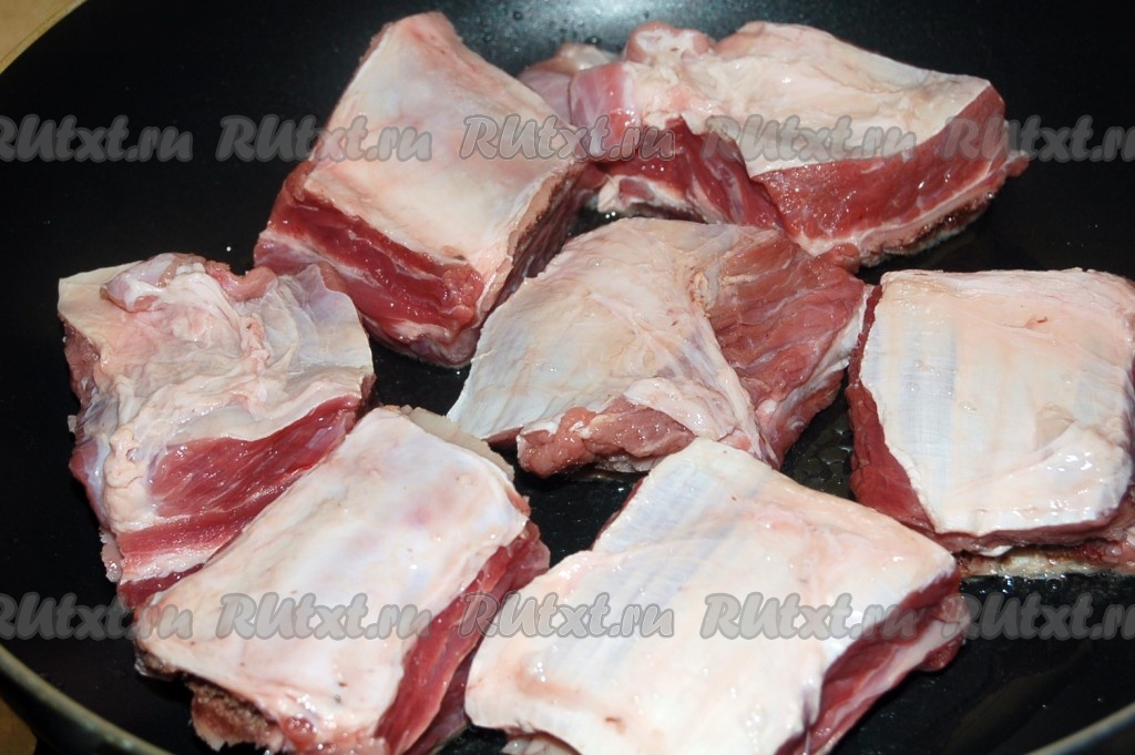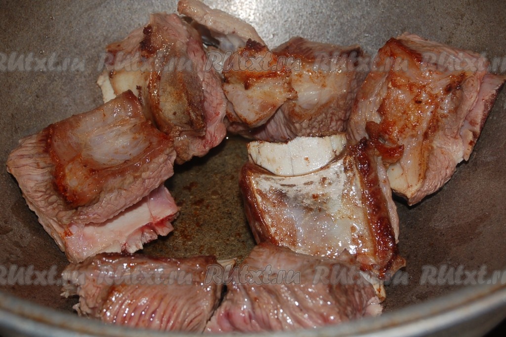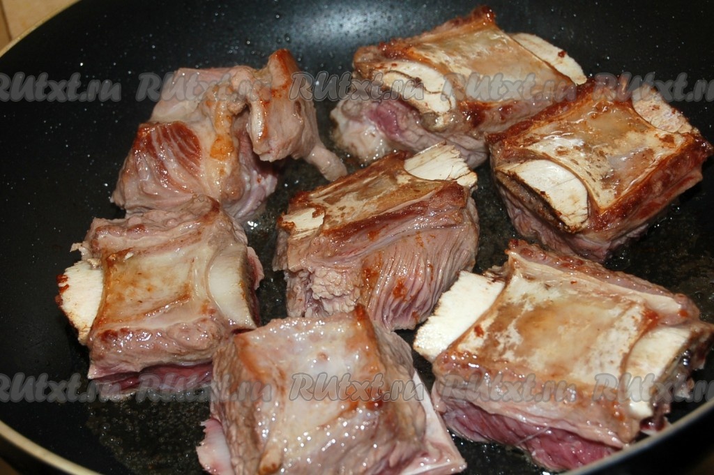 Обжарить говяжьи ребрышки на растительном масле с двух сторон до легкого зарумянивания.