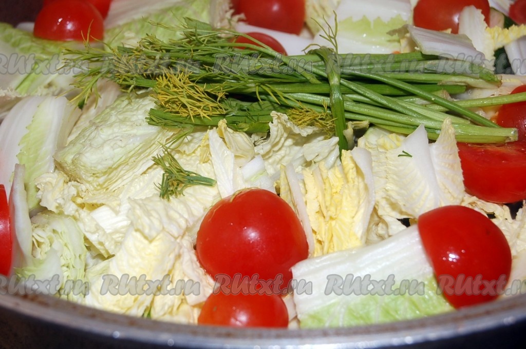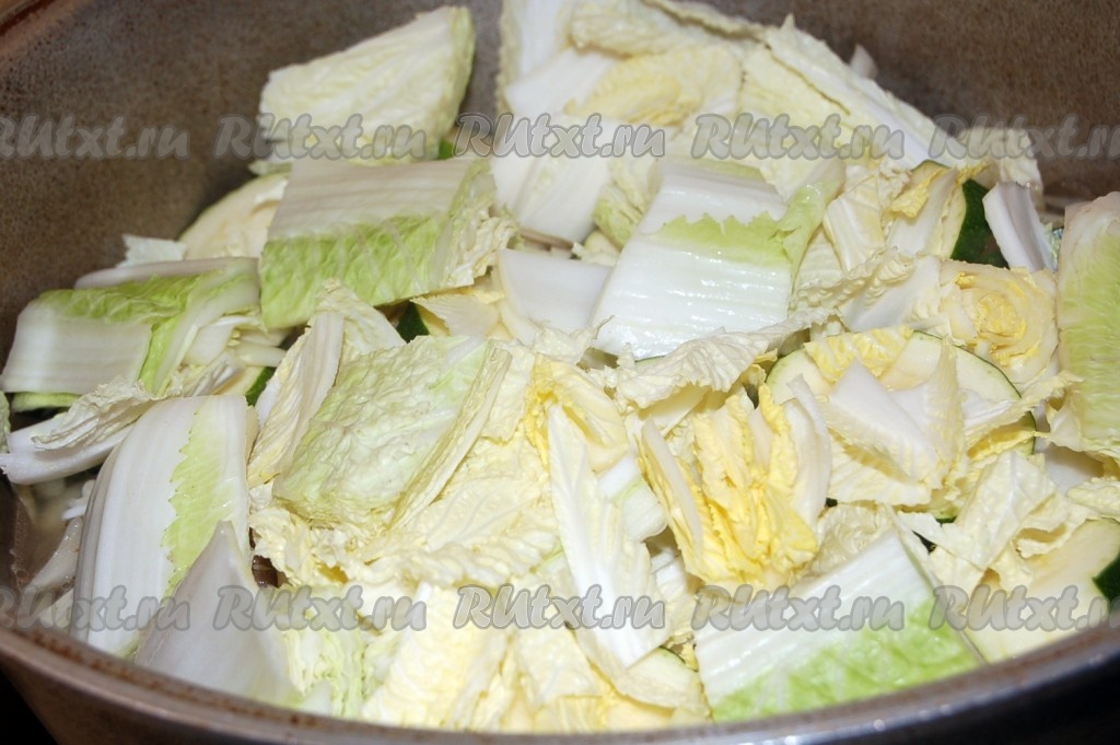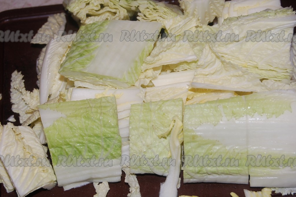 Теперь нашинковать китайскую капусту и разложить ее сверху.