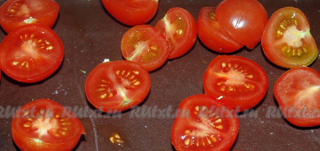 Нарезать помидоры черри на половинки и добавить их к остальным овощам.