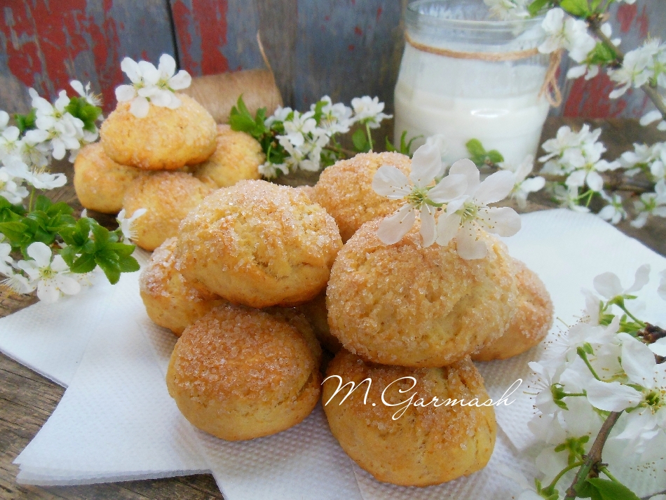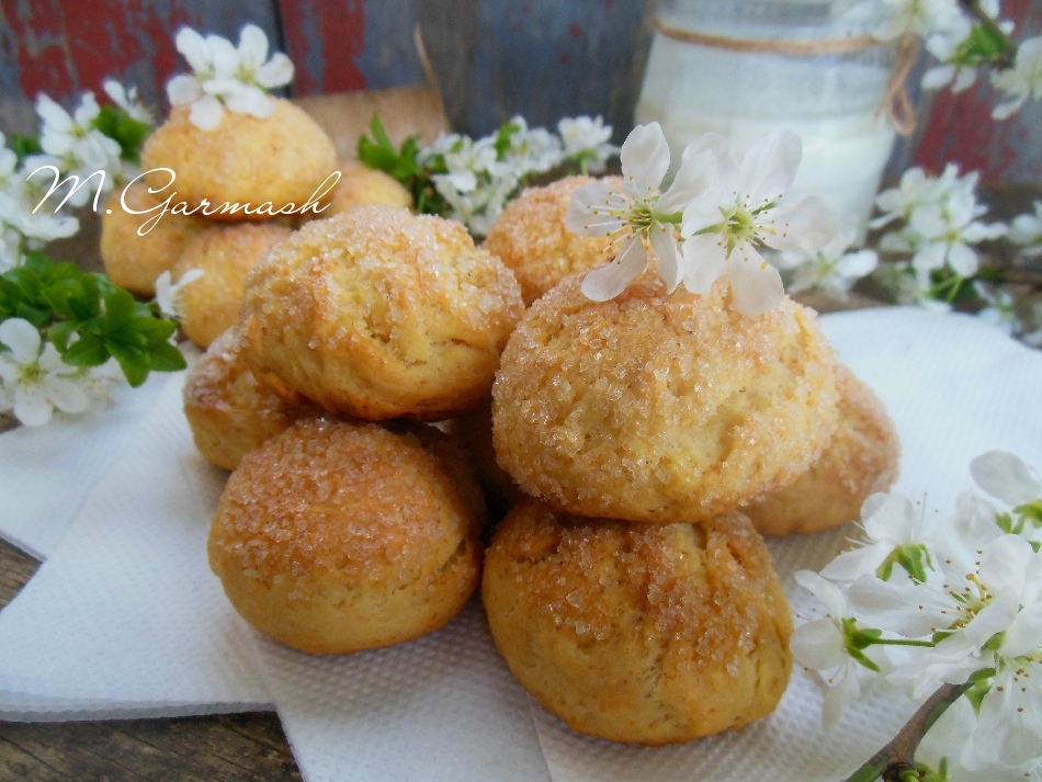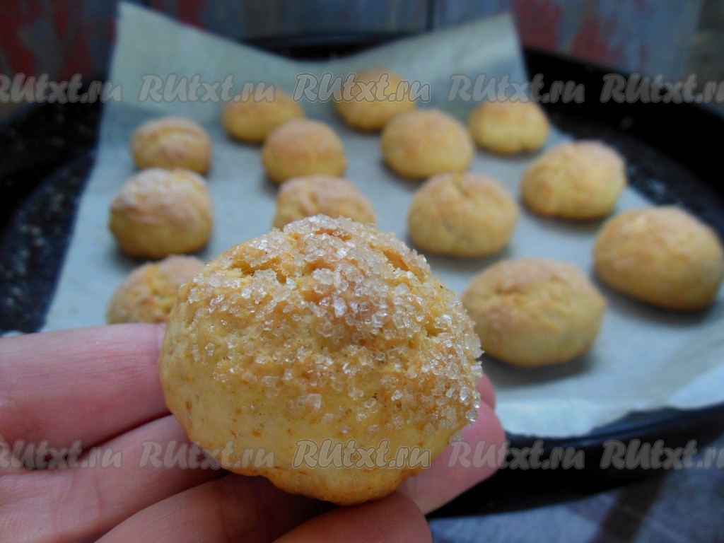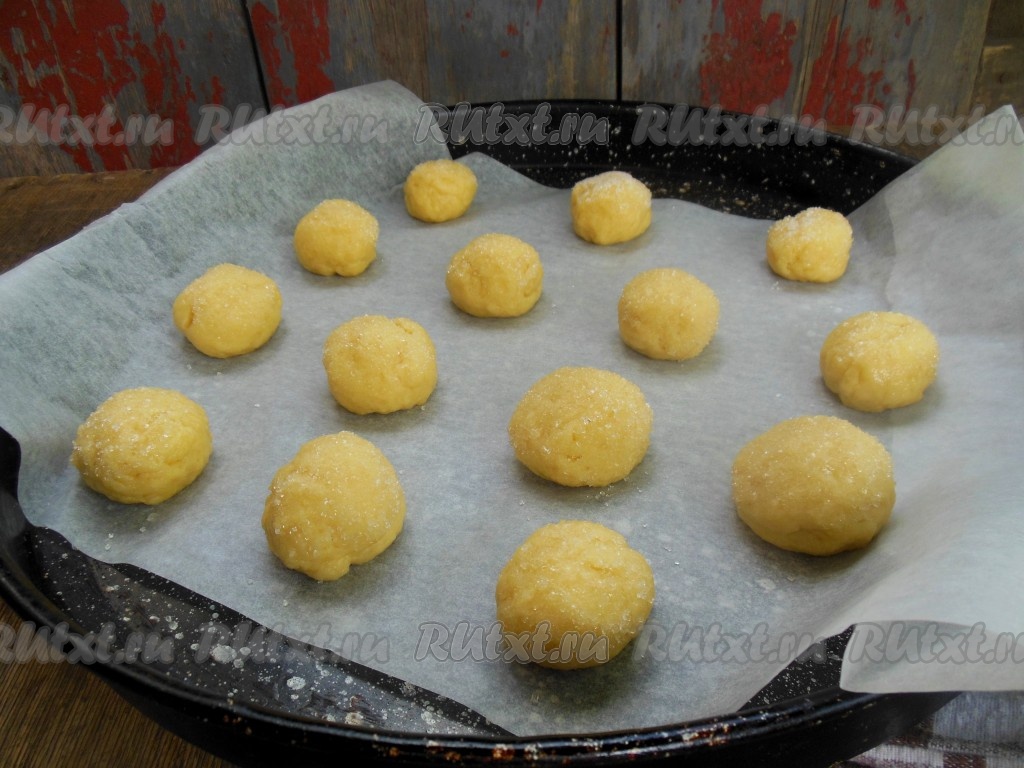На противень, застеленный пергаментом, выложите печенье так, чтобы сторона, посыпанная сахаром, была сверху. Шарики выкладывайте на небольшом расстоянии друг от друга, прижимать ладошкой их не надо.