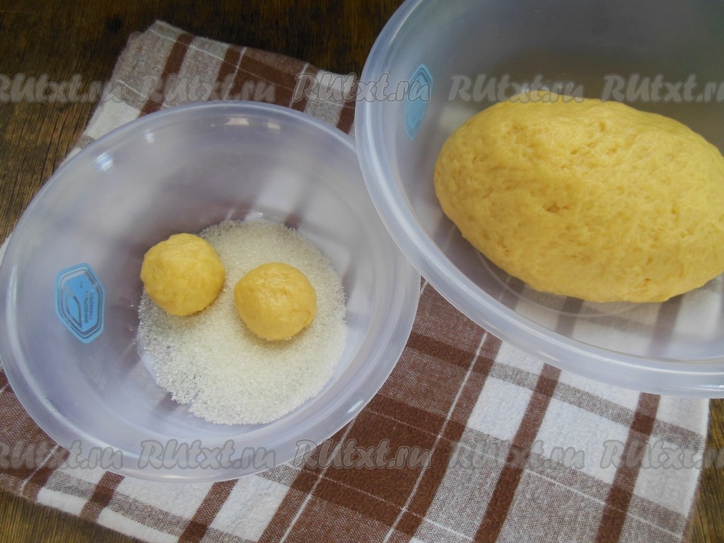Чтобы сформировать печенье, разделите тесто на небольшие шарики, скатайте их в ладошках. В тарелку насыпьте сахар и обмакните шарики с одной стороны.