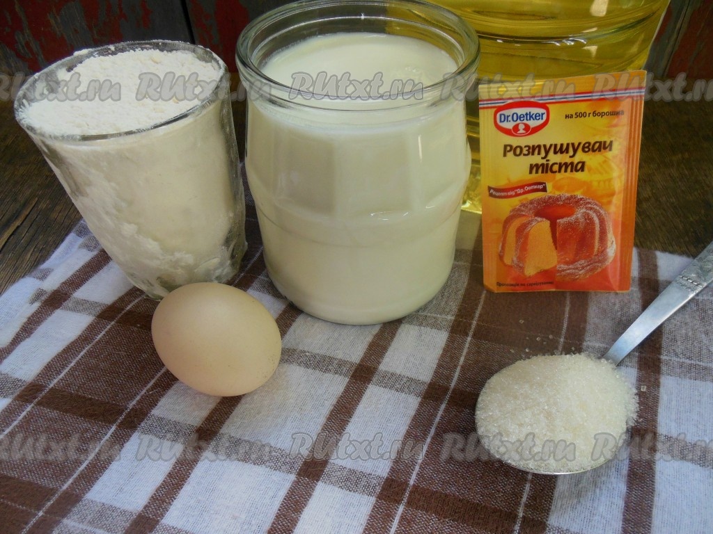 В миску добавьте кефир, куриное яйцо, щепотку соли, 1 столовую ложку сахара и растительное масло.
