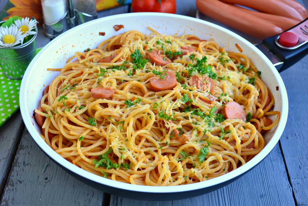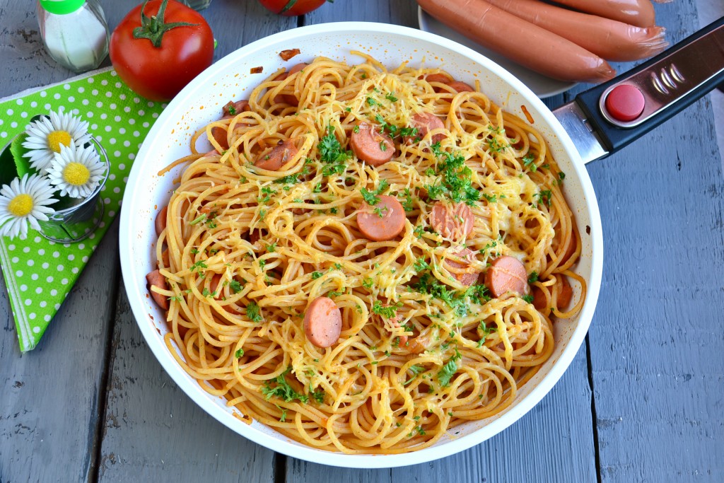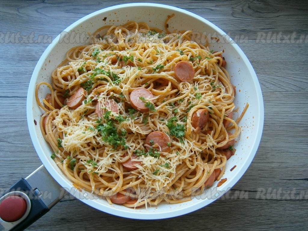 Подать вкуснейшие спагетти, приготовленные с сосисками, к столу в горячем виде.