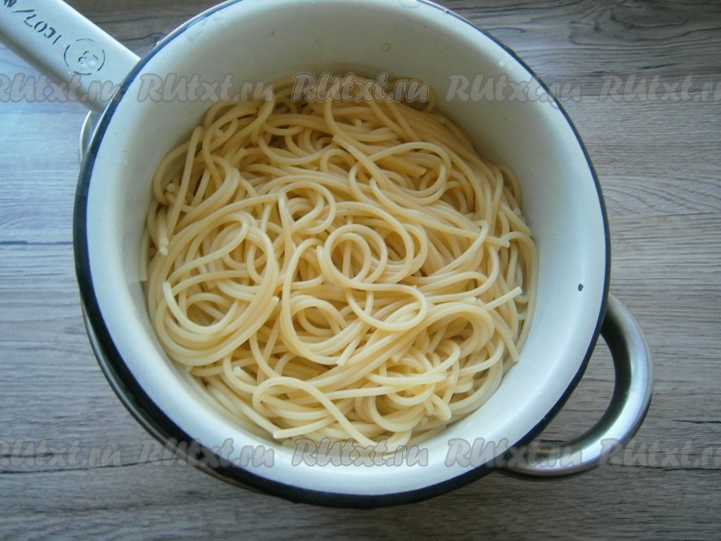Откинуть спагетти на дуршлаг, дать стечь воде.