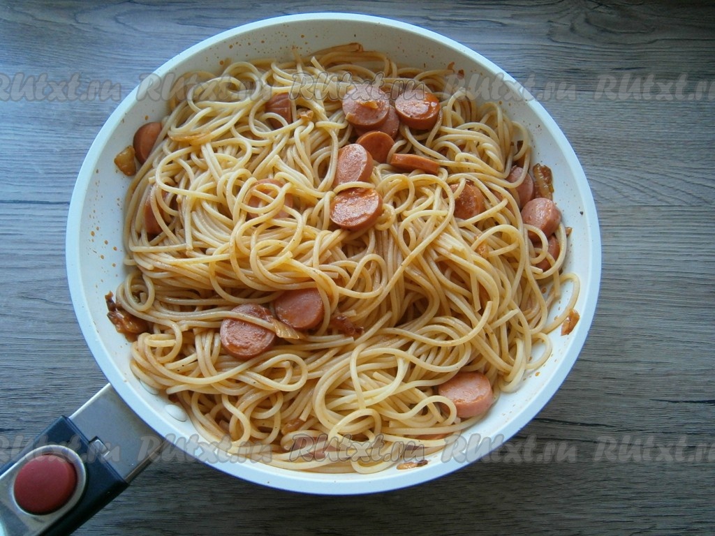 Отваренные спагетти выложить в соус с сосисками, перемешать.