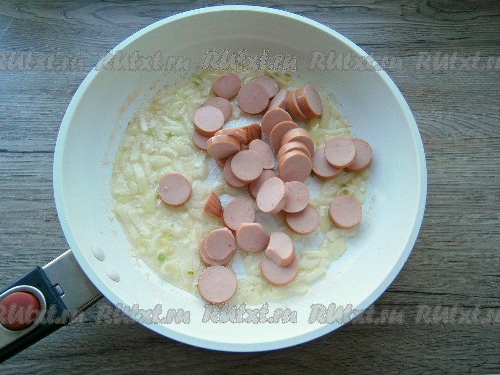 Обжарить лук на среднем огне до мягкости, периодически помешивая, после чего добавить сосиски.