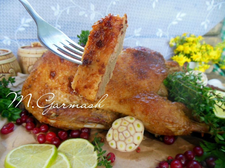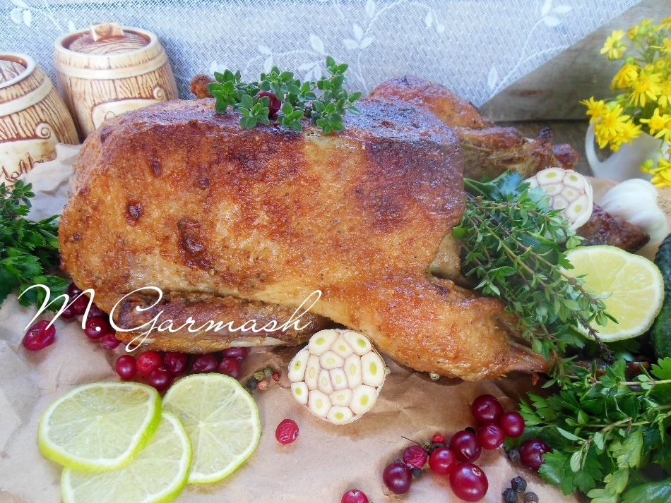 Увеличив температуру до 170 градусов, запекайте птицу еще 25-30 минут, не накрывая фольгой (чтобы утка подрумянилась). Достаем готовую утку из духовки, освобождаем от фольги и можно подавать эту вкуснейшую запеченную птицу к столу.