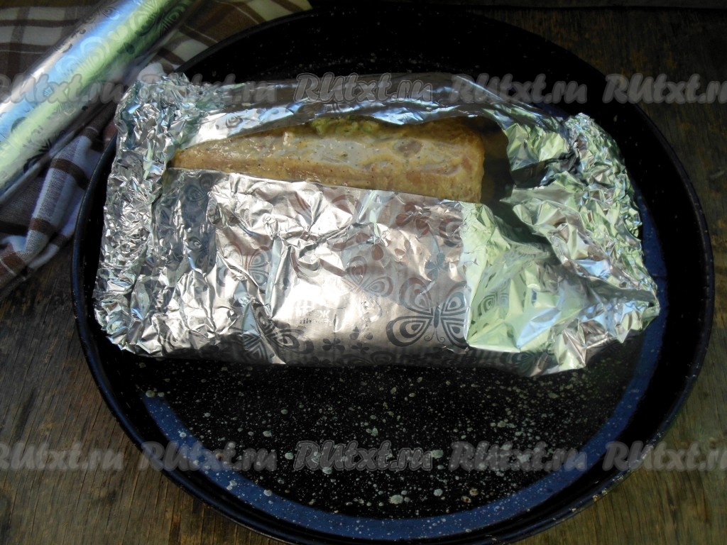 Запекайте утку, полностью завернутую в фольгу, в заранее разогретой духовке при температуре 150-160 градусов 2 часа. По истечении времени достаньте утку из духовки. На фото видно, что из утки в процессе запекания выделилось много сока и жира, которые остались в форме из фольги.