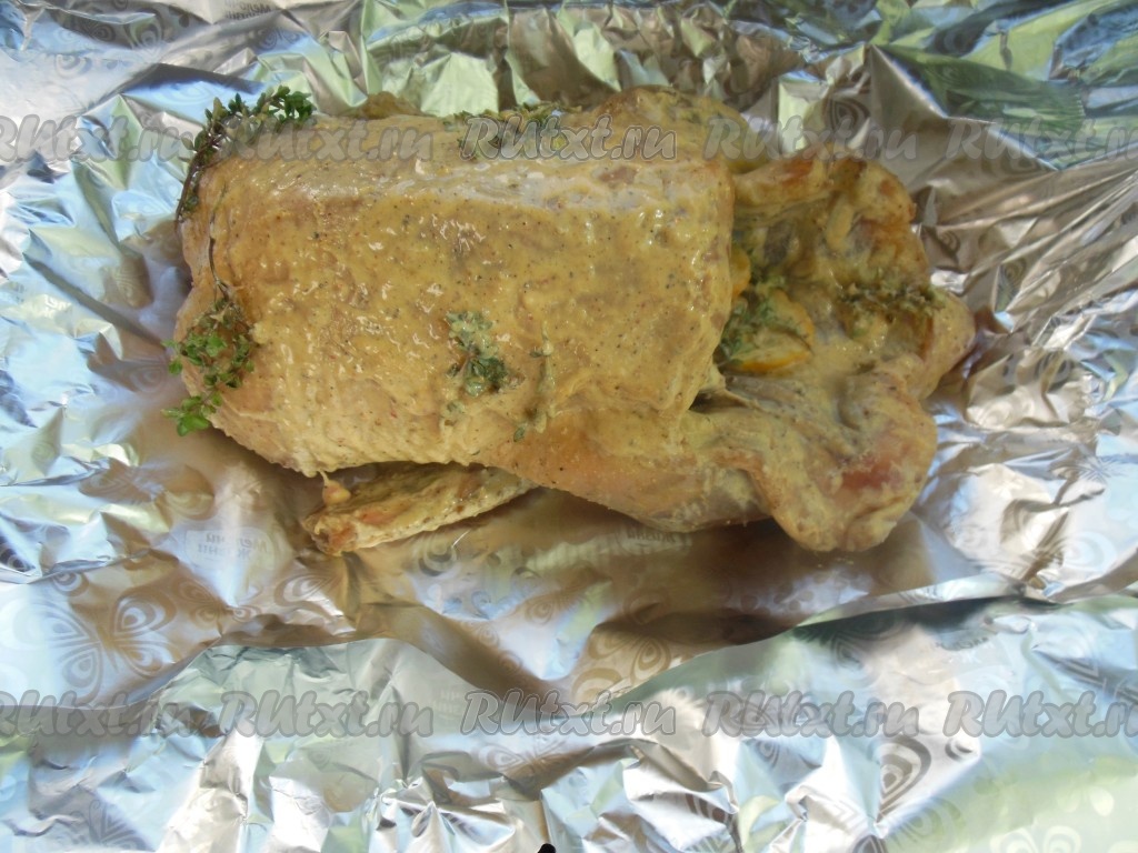 Противень застелите фольгой для запекания в три слоя. Веточки чабреца и колечки лимона уберите во внутрь утки к чесноку. В центр фольги спинкой вниз выложите утку. Заверните птицу в фольгу со всех сторон, сверху накройте еще двойным слоем фольги, но только так, чтобы можно было легко раскрыть верх фольги.