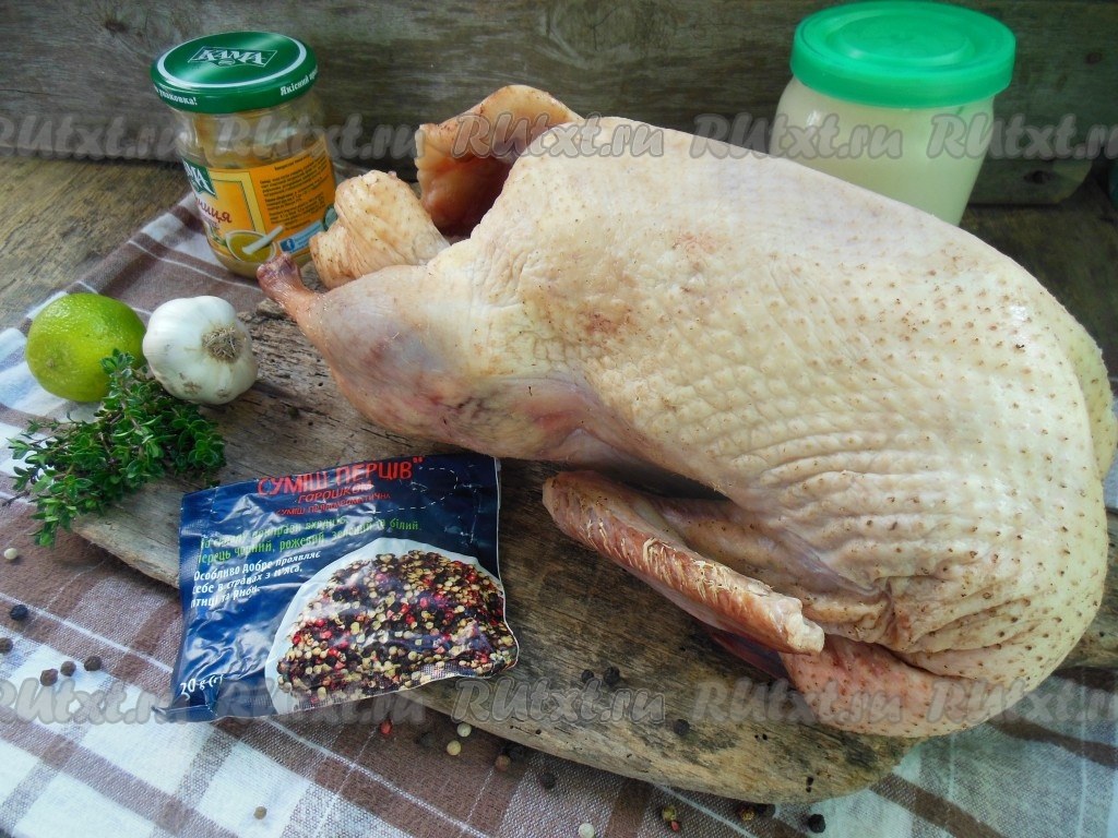 Натрите утку внутри и снаружи соусом для маринования (примерно, 1 чайную ложку соуса оставьте, он пригодится для смазывания птицы в процессе запекания). Сверху полейте тушку утки соком, выжатым из кружочков лимона (или лайма), внутрь и снаружи выложите колечки лимона (или лайма), из которых выдавили сок, посыпьте веточками чабреца. Разрезанную головку чеснока вложите во внутрь утки. Поместите утку в миску и оставьте мариноваться на 2-3 часа (но лучше отправить утку мариноваться на ночь в холодильник).