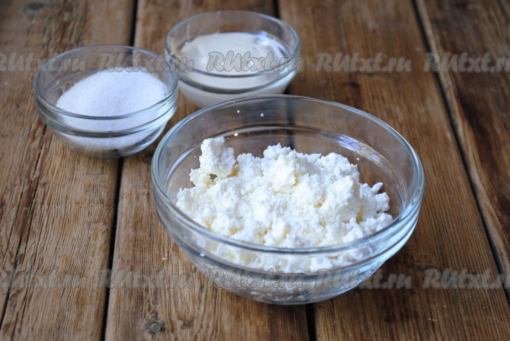 Для приготовления творожной начинки нам понадобятся творог, сметана и сахар. Количество сметаны и сахара зависит от вашего вкуса.