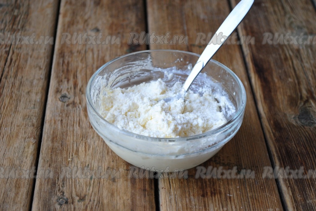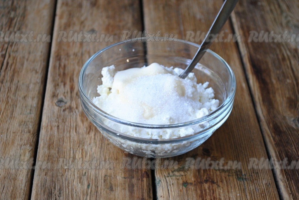Творог соединить с сахаром и сметаной.