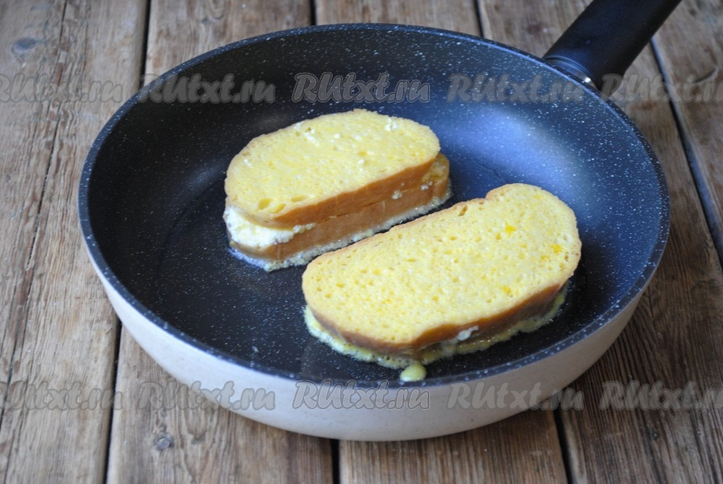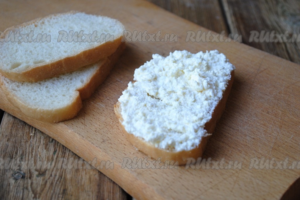 Ломтик хлеба щедро смазать творожной массой, сверху накрыть вторым ломтиком. В результате должно получиться 4 заготовки, каждая из которых состоит из двух кусков хлеба, скрепленных творожной массой. Может выйти и больше заготовок, смотря, какое количество творожной массы вы будете намазывать на хлеб.