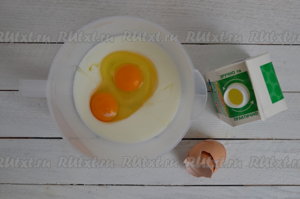 В глубокую миску влить кефир комнатной температуры и добавить куриные яйца.