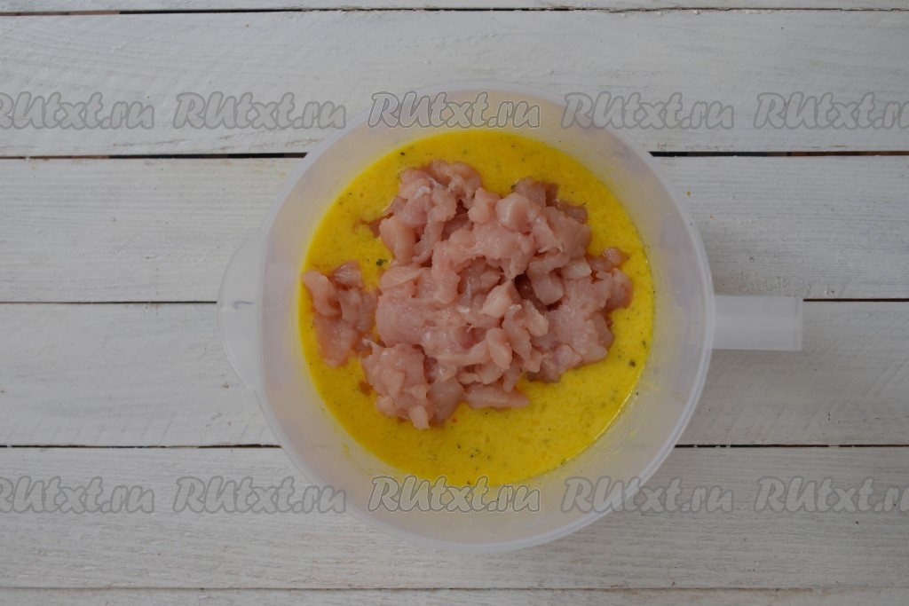 Добавить куриное мясо. Его можно перемолоть мясорубкой, блендером или мелко нарезать.