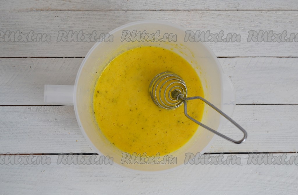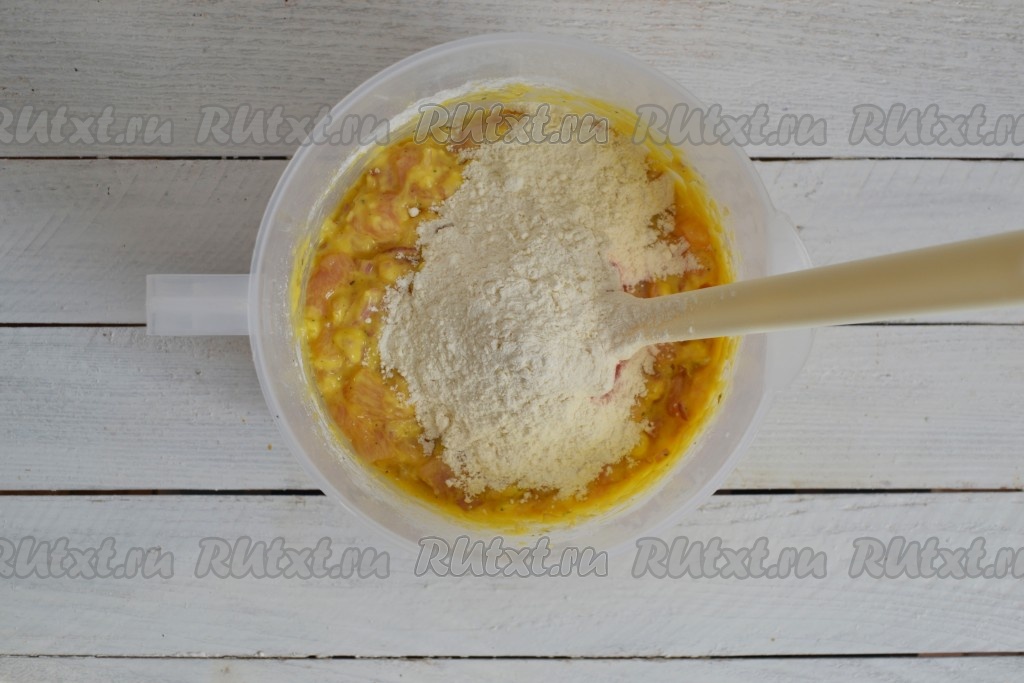 Перемешать получившуюся массу, всыпать просеянную муку и ещё раз хорошо перемешать тесто.