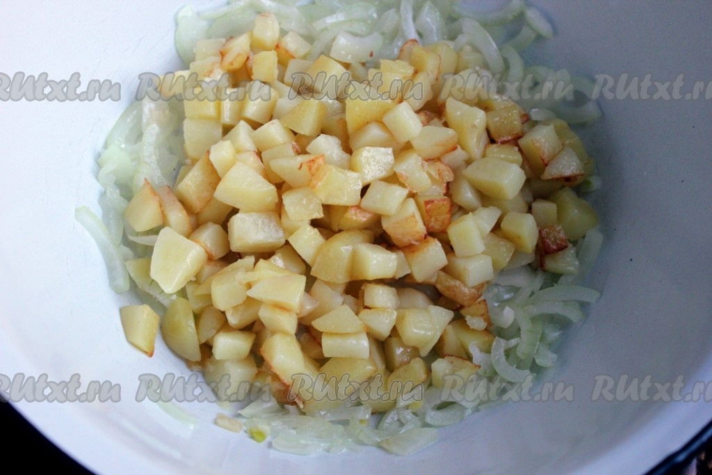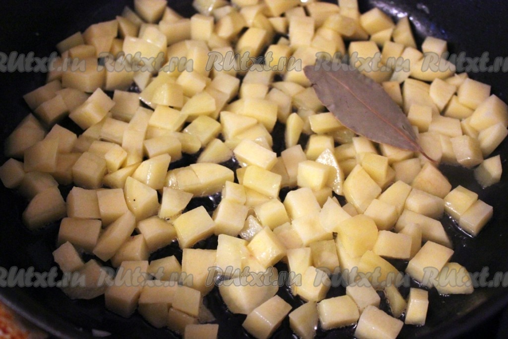 Картофель почистить, нарезать кубиками и тоже быстро обжарить на растительном масле: сначала на сильном огне, а потом на среднем под крышкой и листочком лавровым.