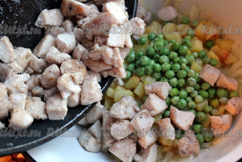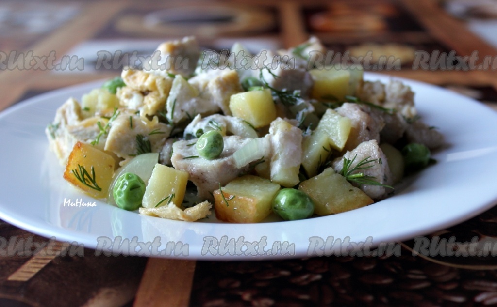 Затем разморозить на горячей сковороде зелёный горошек или стручковую фасоль и добавить к луку и картошке. Куриное мясо нарезать на маленькие кусочки, посыпать специями для курицы, посолить и быстро обжарить на растительном масле, постоянно помешивая и встряхивая. Все ингредиенты салата соединить, добавить рубленый свежий укроп.