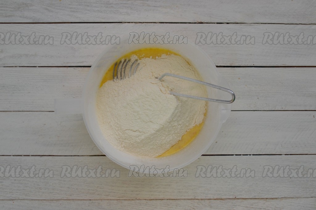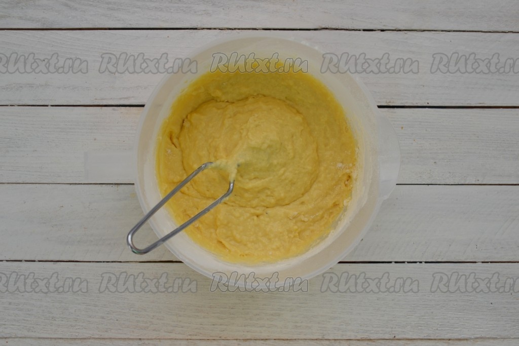 Тщательно перемешать получившуюся массу, мука должна полностью разойтись и только потом, постоянно помешивая, небольшими частями добавлять оставшуюся муку.