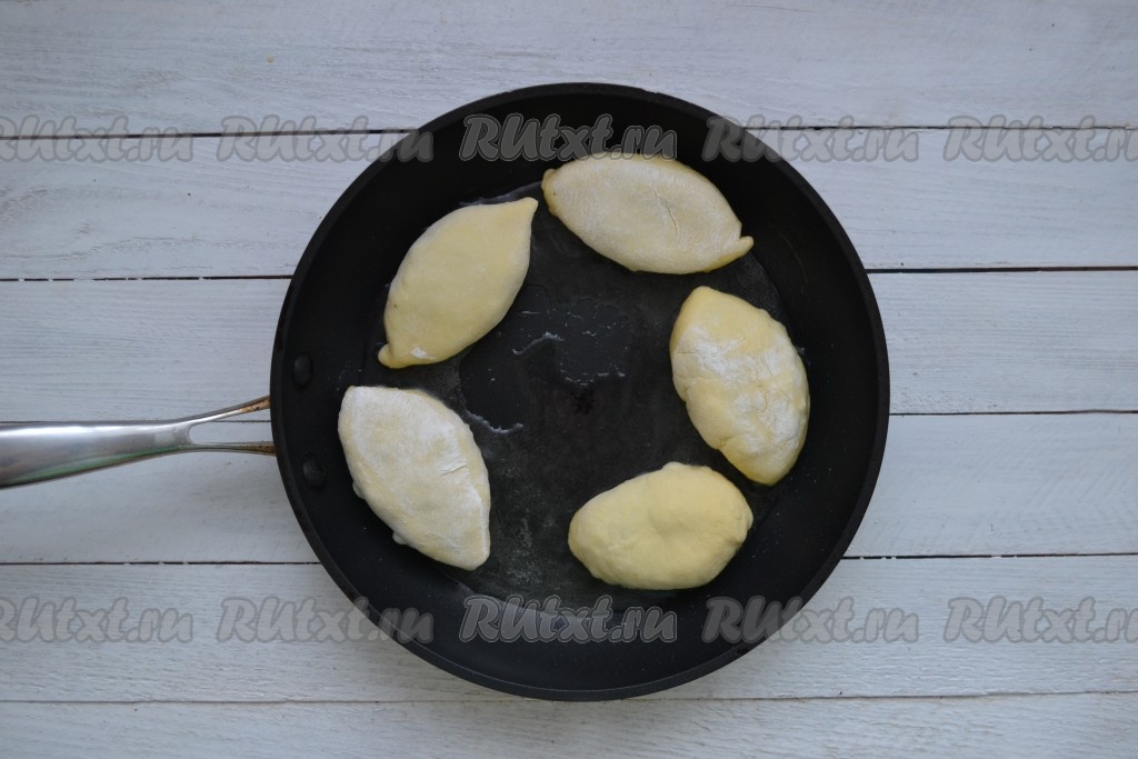 Слегка прижать каждый пирожок сверху ладошкой, придавая приплюснутую форму. Когда все заготовки будут готовы, можно приступать к жарке. Вначале нужно жарить пирожки, которые слепили первыми, так как они уже "отдохнули" и немного подошли. В сковороду влить 50-70 мл растительного масла и, когда оно хорошо разогреется, выложить заготовки пирожков. Обжарить с каждой стороны до румяности (минут по 6-7) на умеренном огне.
