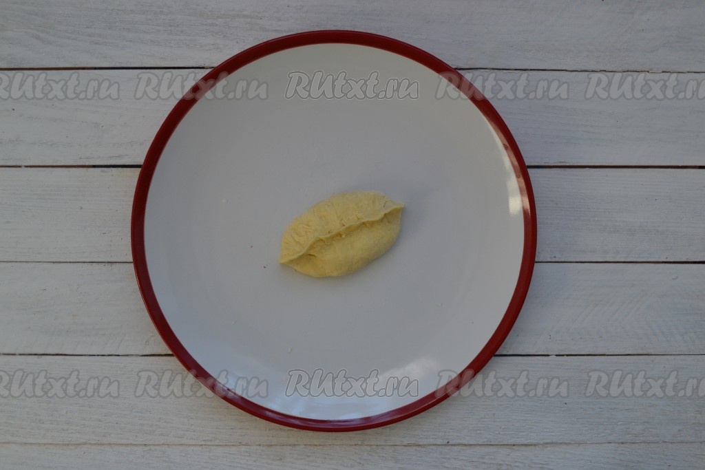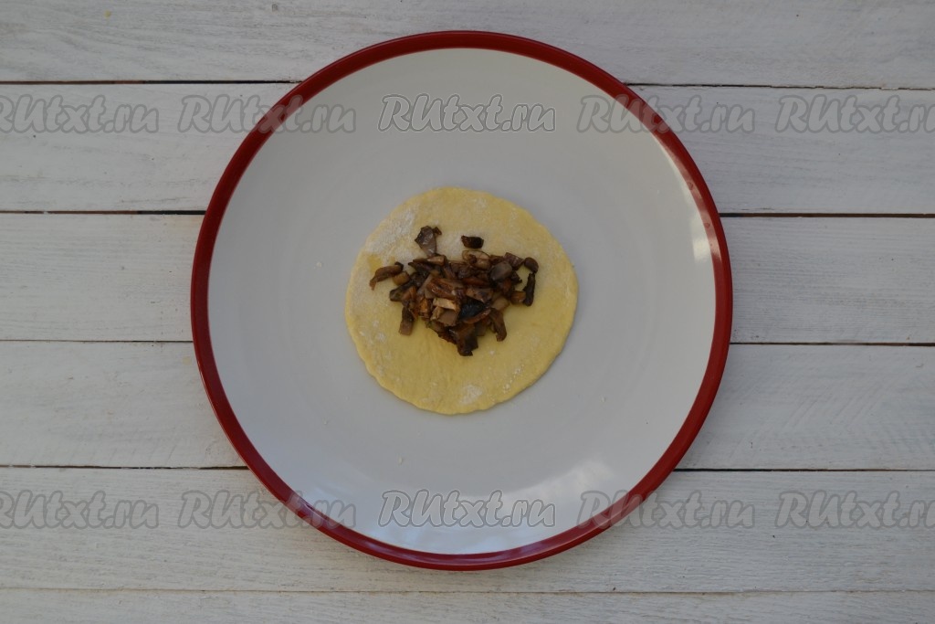 Защипать края теста, формируя пирожок. Аналогично подготовить все пироги с грибной начинкой. Пирожки из такого теста лепить одно удовольствие, так как тесто не тянется за пальцами, легко склеивается.
