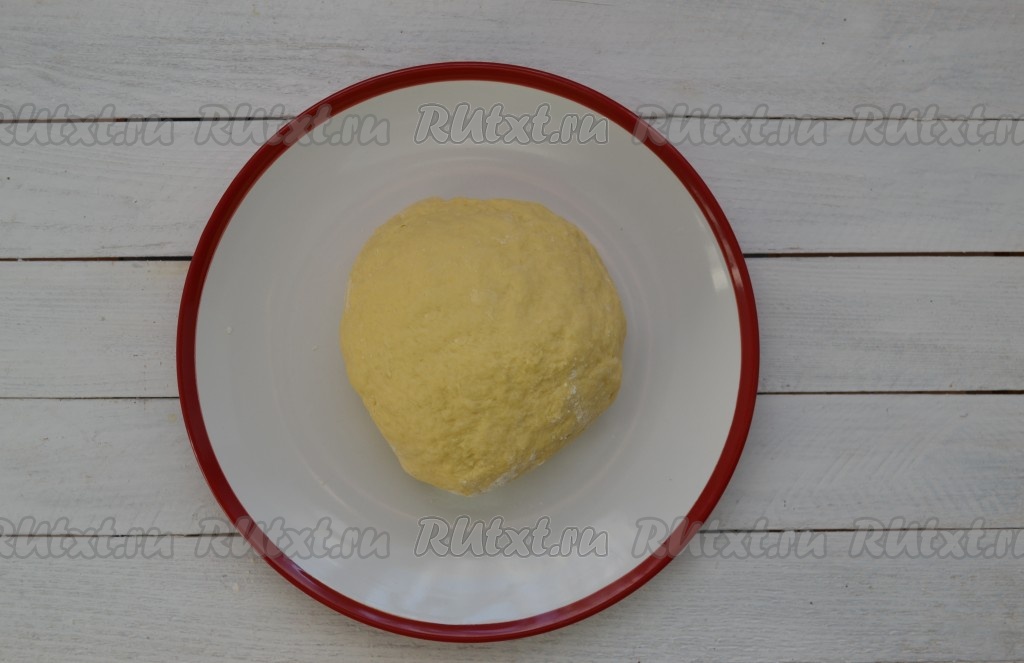 Замесить мягкое, послушное тесто. Тесто для жареных пирожков, замешанное на сыворотке, не должно липнуть ни к рукам, ни к рабочей поверхности, поэтому его нужно продолжать вымешивать еще 15-20 минут, после того как была добавлена вся мука. Но если все же тесто прилипает, нужно смочить руки растительным маслом и продолжить вымешивать. Готовое тесто накрыть салфеткой и оставить на 30 минут в теплом месте. За это время тесто увеличится в два раза.