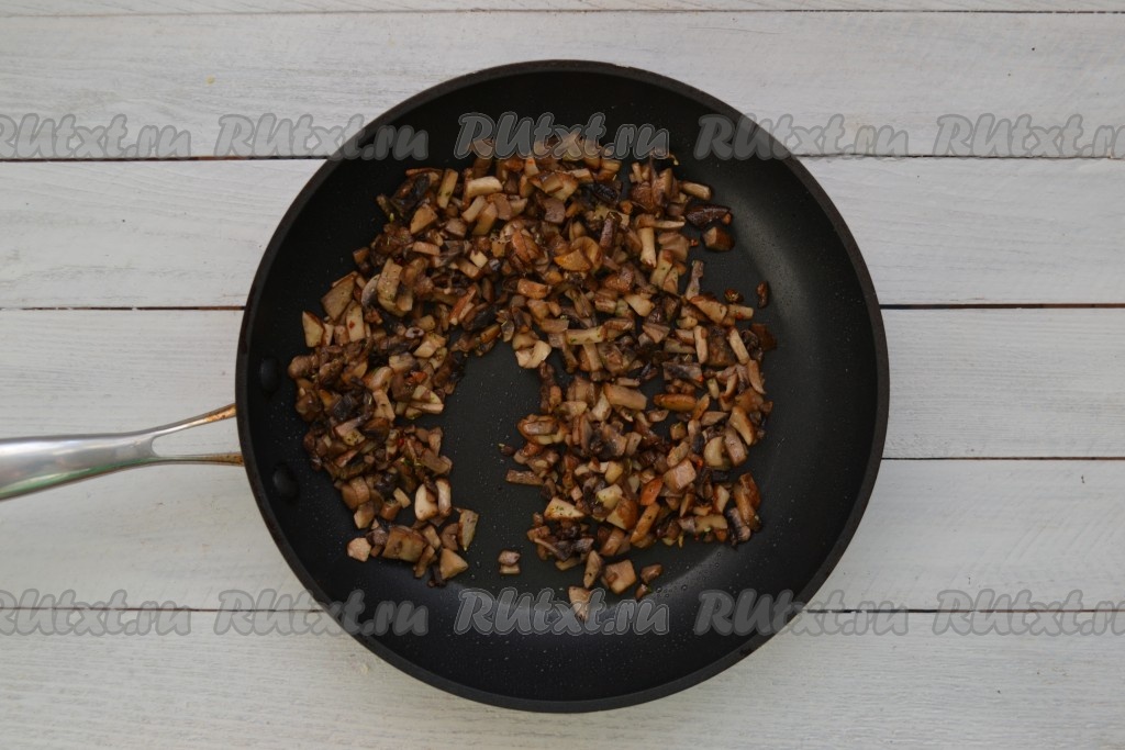 В это время подготовить начинку. Начинку для жареных пирожков, замешанных на сыворотке, можно приготовить любую по вашему вкусу. Я решила сделать грибную начинку, для этого нужно вымыть и мелко нарезать шампиньоны. В разогретую сковороду влить 1 столовую ложку растительного масла, через минуту выложить грибы, помешивая, обжарить их 10-15 минут на умеренном огне. Вся жидкость, образовавшаяся в сковороде, должна испариться. За 2 минуты до окончания приготовления добавить по вкусу соль. Готовую грибную начинку снять с огня и остудить.