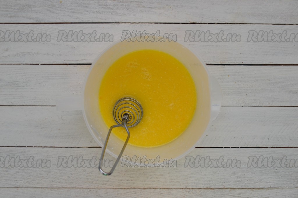 В миску влить сыворотку комнатной температуры, добавить яйцо и 1/2 чайной ложки соли, тщательно взбить венчиком.