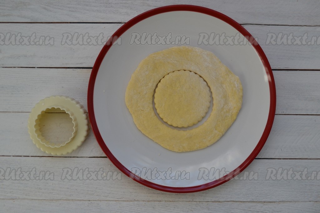 Подошедшее и отдохнувшее тесто еще раз хорошенько вымесить, раскатать в пласт толщиной 4-5 мм и вырезать круги одинакового размера (для вырезания кружочков можно использовать форму для вырубки или обычный стакан). Диаметр кружочков из теста будет зависеть только от ваших предпочтений: чем больше круг, тем больше будет в итоге пирожок.
