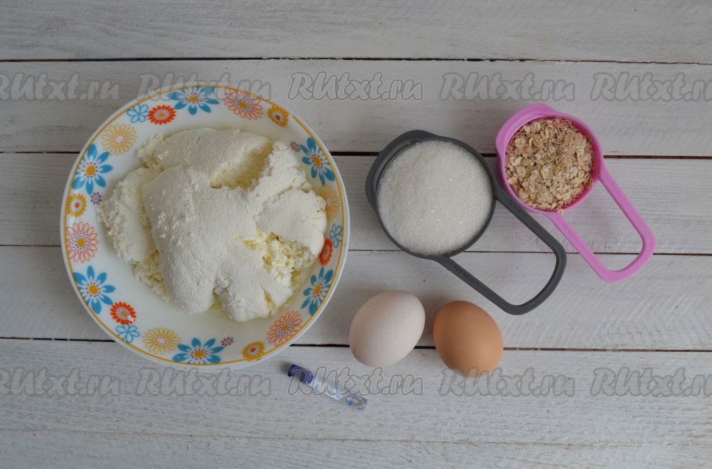 В смесь творога и яиц всыпать сахар и муку. Я вместо муки решила добавить овсяные хлопья. Хлопья можно использовать любые: крупные или мелкие.