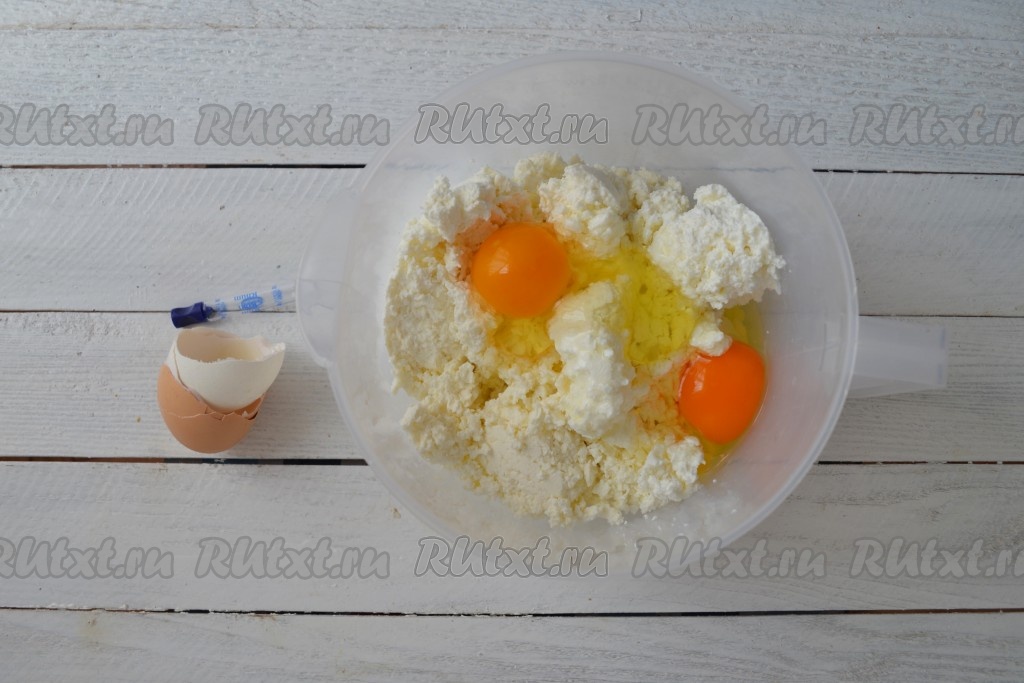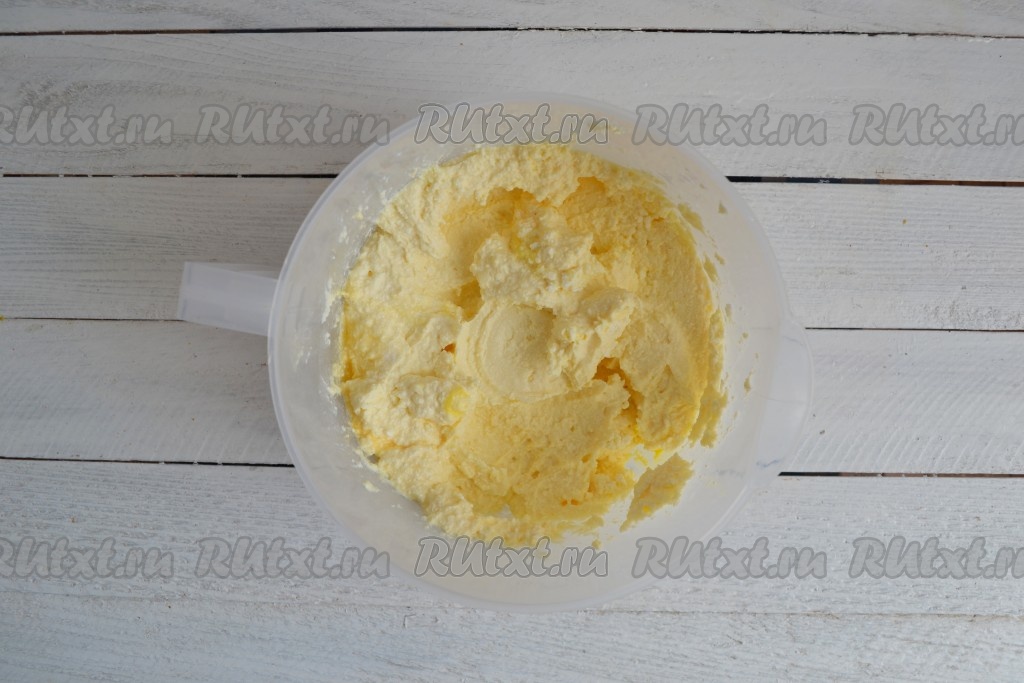 Творог с яйцами перетереть блендером в нежную, однородную массу. Если нет блендера, перед добавлением яиц творог нужно протереть через сито или прокрутить 2-3 раза через мясорубку с мелкой решеткой.
