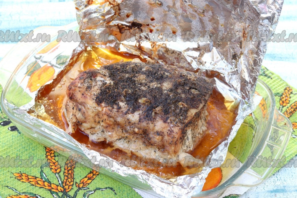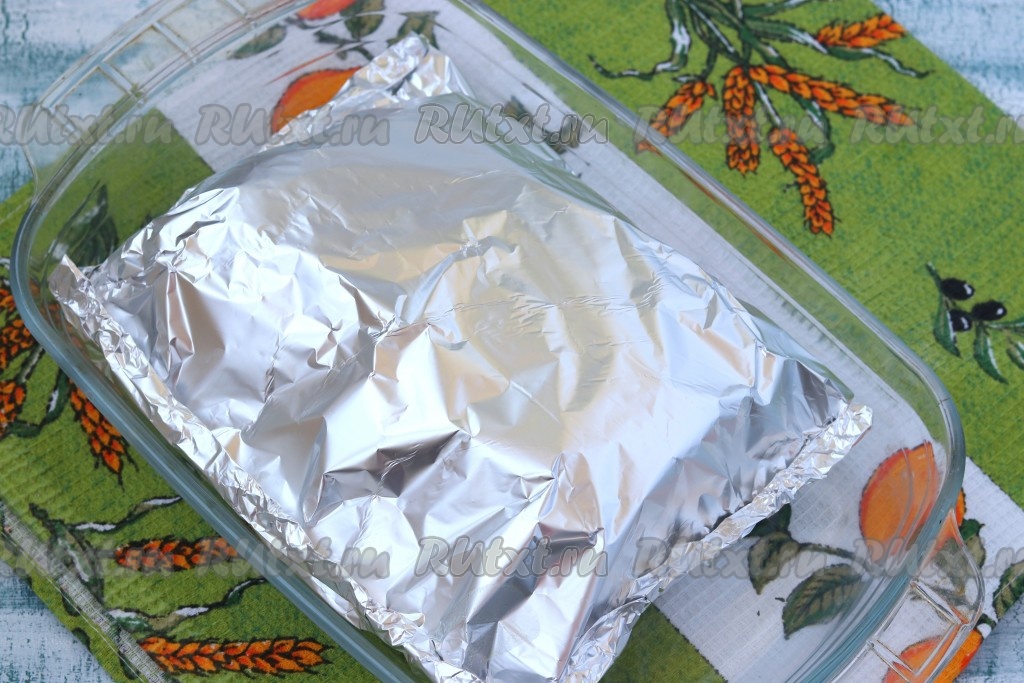 Спустя это время в форму для запекания выложить фольгу, оставляя свободный край настолько, чтобы хватило накрыть мясо. Свинину выложить на фольгу.