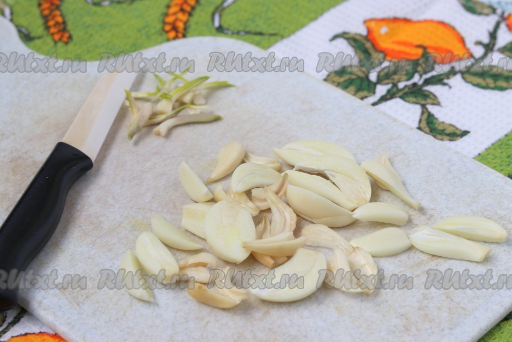 Первым делом подготовить чеснок. Зубчики чеснока очистить от шелухи, удалить проросшие зеленью сердцевины и нарезать пластинками.