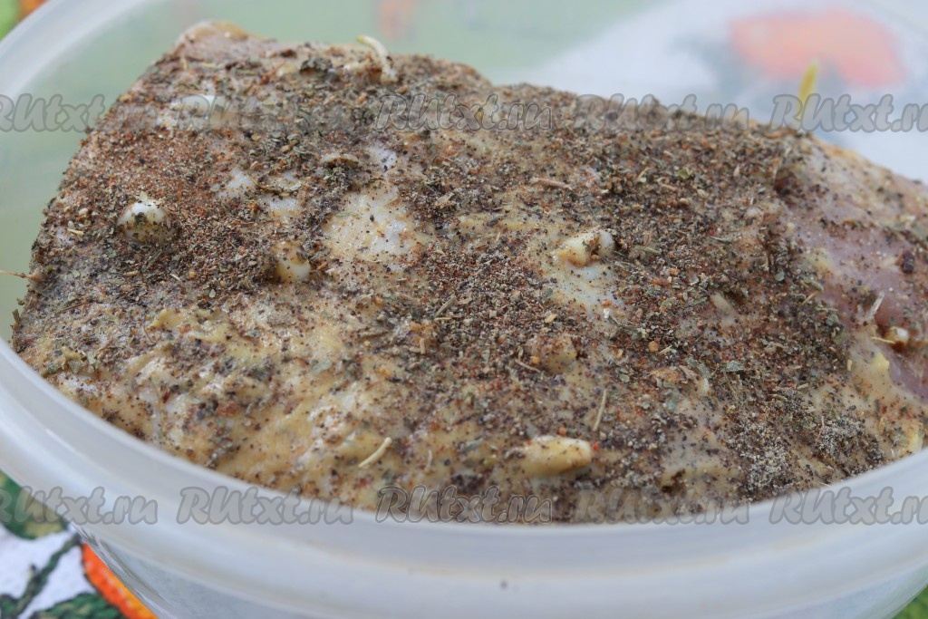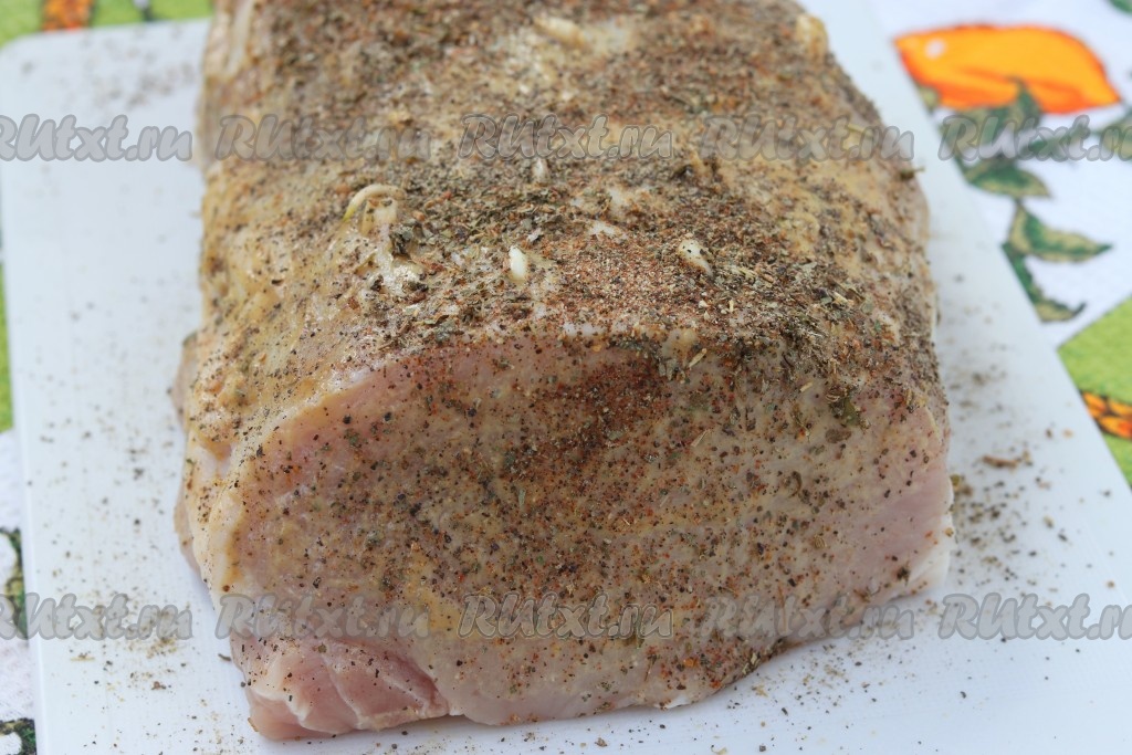 Горчицу смешать с гранатовым соусом и обмазать мясо со всех сторон. Можно использовать только горчицу, просто мне в этот раз для усиления вкуса захотелось добавить соус. Затем свинину обсыпать оставшимися специями.