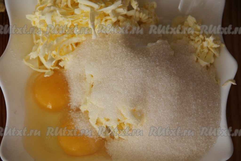 Добавить все остальные компоненты для песочного теста (мука, сахар, яйца, ванильный сахар, разрыхлитель).