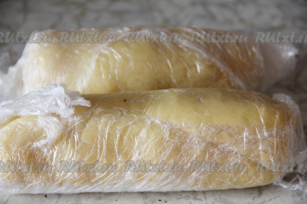 Разделить тесто на 2 части и из каждой части сделать по 2 сосисочки. Обмотать каждую в пакет и отправить в морозилку на 30 минут.