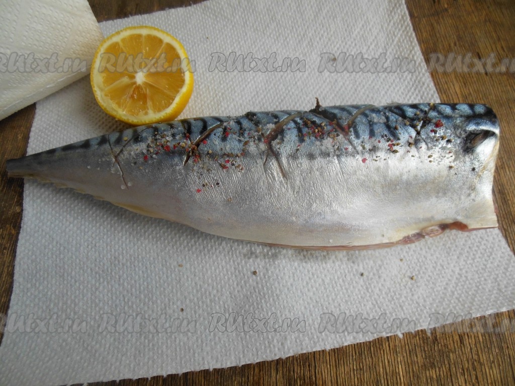 Рыбу разморозьте, очистите от внутренностей. Удалите голову, хвост и плавники. Тщательно промойте скумбрию, удалив черную пленочку внутри. Промокните бумажным полотенцем. С помощью острого ножа сделайте с обеих сторон неглубокие крестообразные надрезы по спинке. Снаружи и внутри посолите, поперчите скумбрию и полейте лимонным соком.
