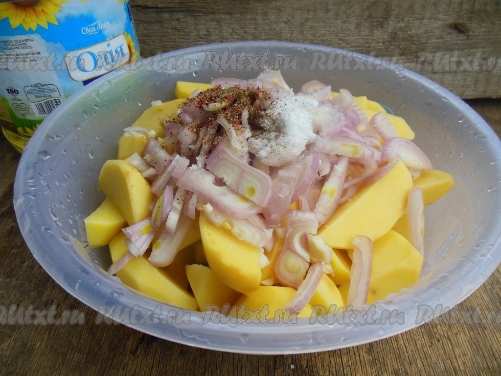 Очищенный репчатый лук нарежьте полукольцами. Соедините в глубокой миске картофель и репчатый лук, добавьте по вкусу соль и перец, тщательно перемешайте, влейте растительное масло, ещё раз перемешайте.