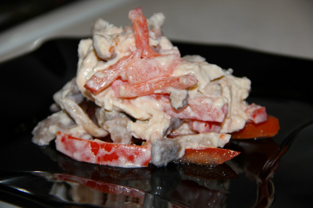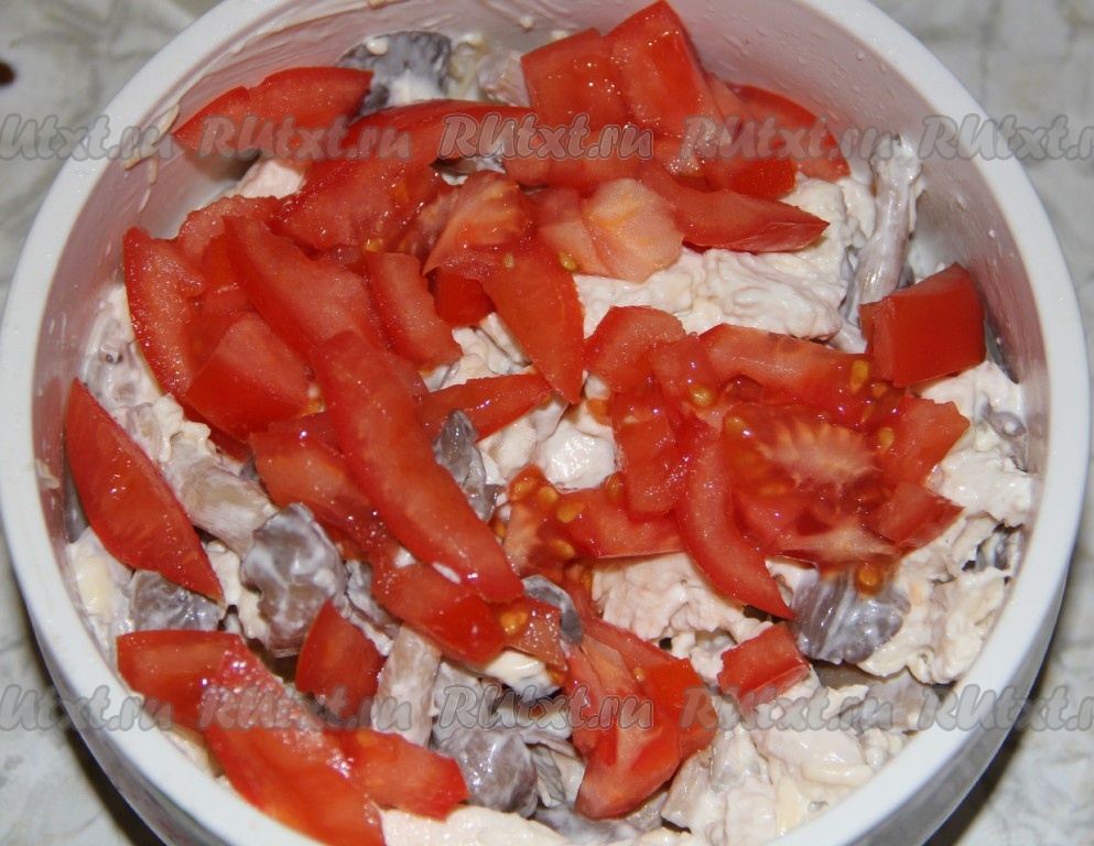 Заправляем наш салат майонезом. Непосредственно перед подачей добавляем нарезанные помидоры.