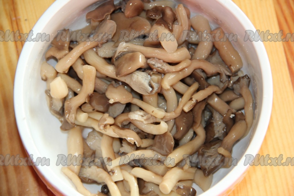 Маринованные опята выкладываем на тарелку (жидкость из банки выливаем, она нам не понадобится).