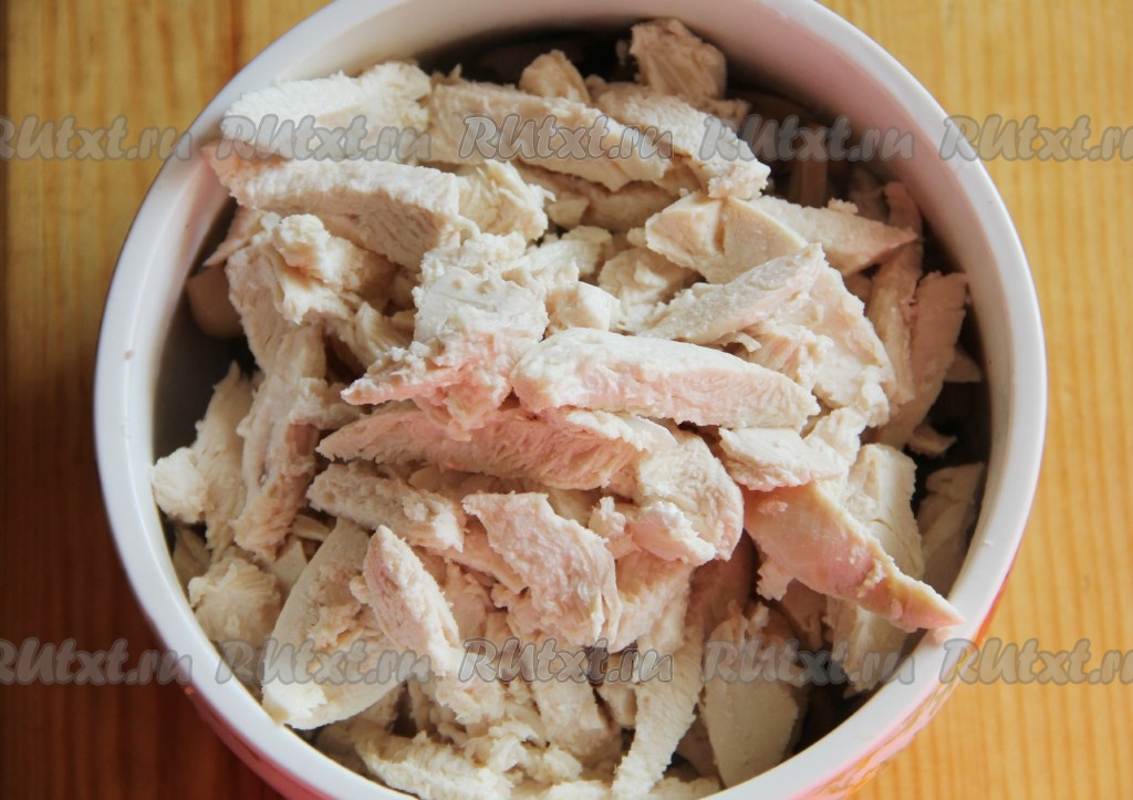 Куриное филе отвариваем до готовности в подсоленной воде и нарезаем соломкой. Для этого салата мне больше нравится, когда курица нарезана именно соломкой, но вы можете нарезать, как вам больше нравится, на вкусе это не отразится.