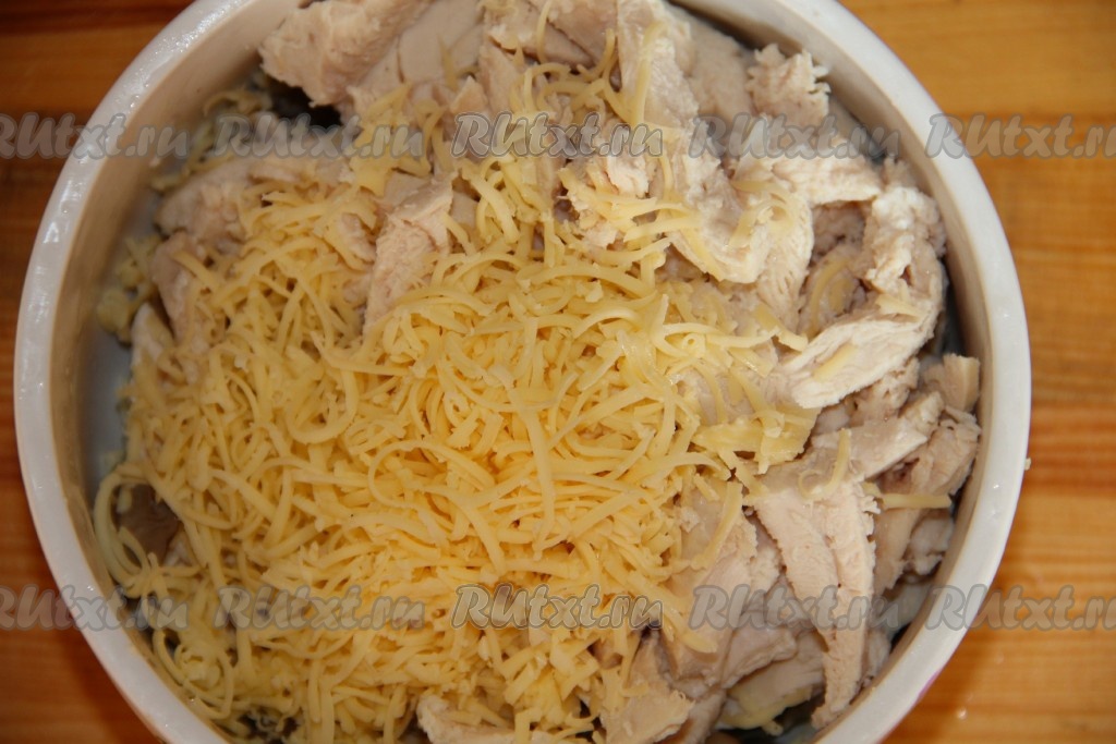 Сыр для салата натираем на терке и добавляем к опятам и курице. Следим за тем, чтобы куриное филе было остывшим и не расплавило наш сыр.
