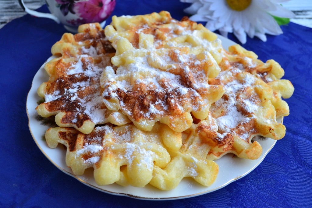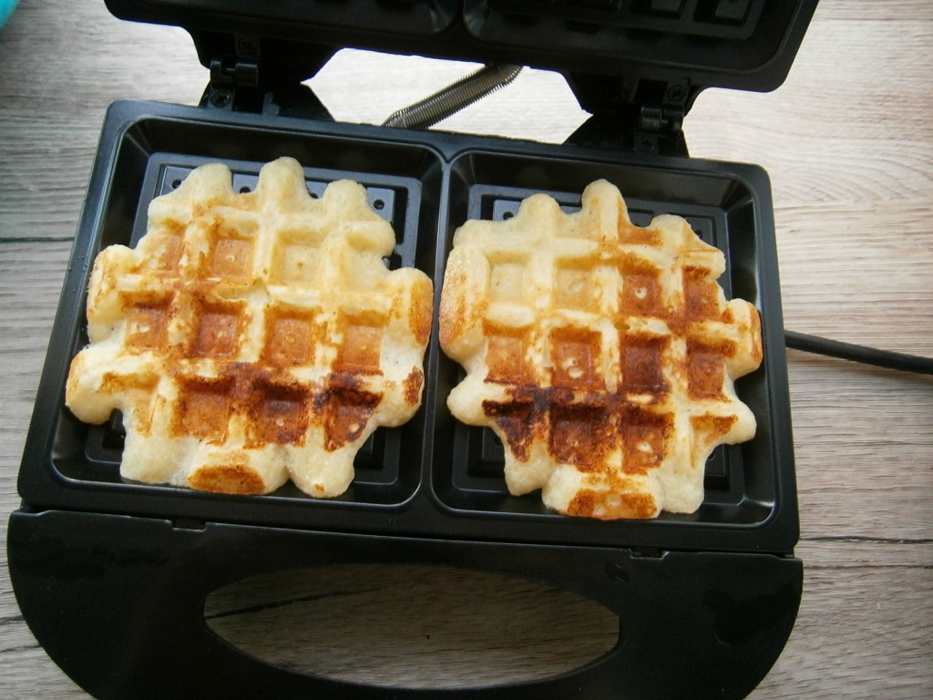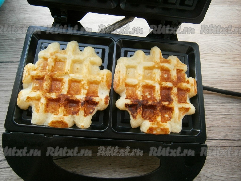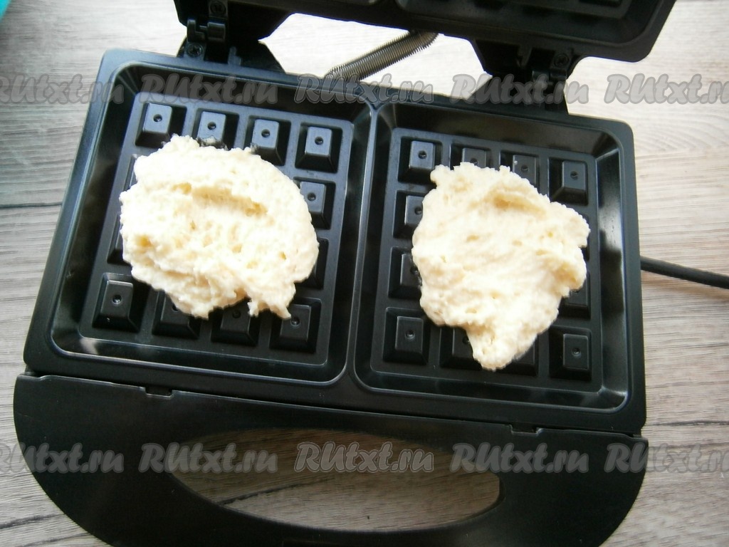 Вафельницу хорошо разогреть. Выкладывать по 2 столовые ложки теста, немного его разравнивая, крышку закрыть.